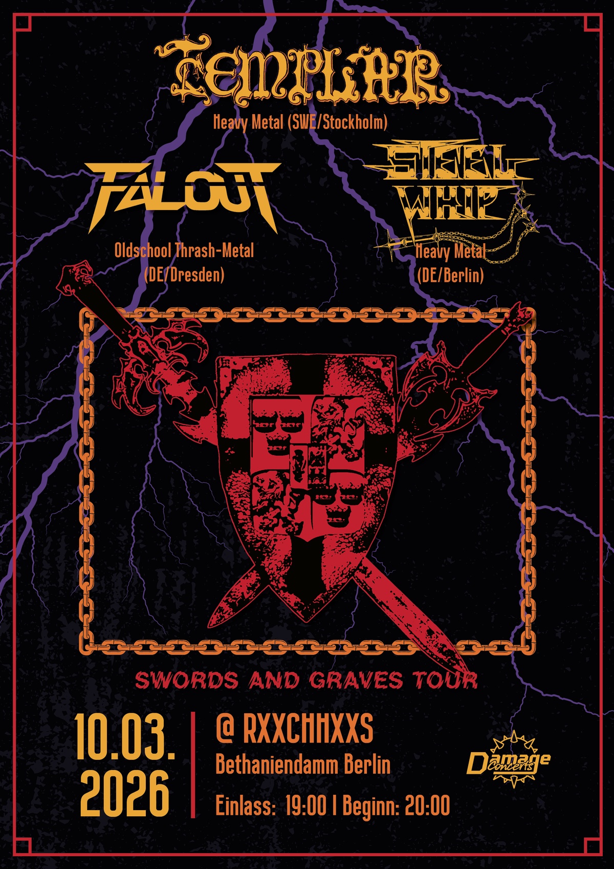With TEMPLAR releasing their new Album Conquering Swords in February they bring raw,traditional Heavy Metal on the Stage. Supported by FALOUT, a Newcomer Oldschool Metal Band with pure On-Stage Power and razor sharp Riffs. And STEEL WHIP with a dungeon like Underground Heavy-Metal Punk Sound and memorizeable Riffs, that punch right into your Soul